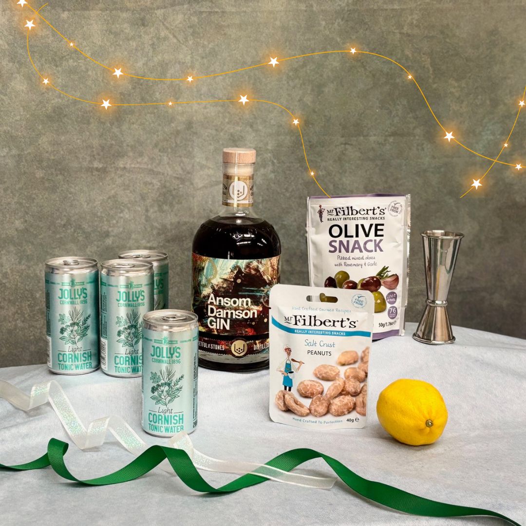 Celebrate the festive season with our Damson Gin & Gourmet Nibbles Hamper — including Ansom Damson Gin, Jolly’s tonics, mixed olives, and salted nuts. Perfect for gifting or indulgence. Each hamper comes with FREE weekday national delivery and a handwritten gift card.